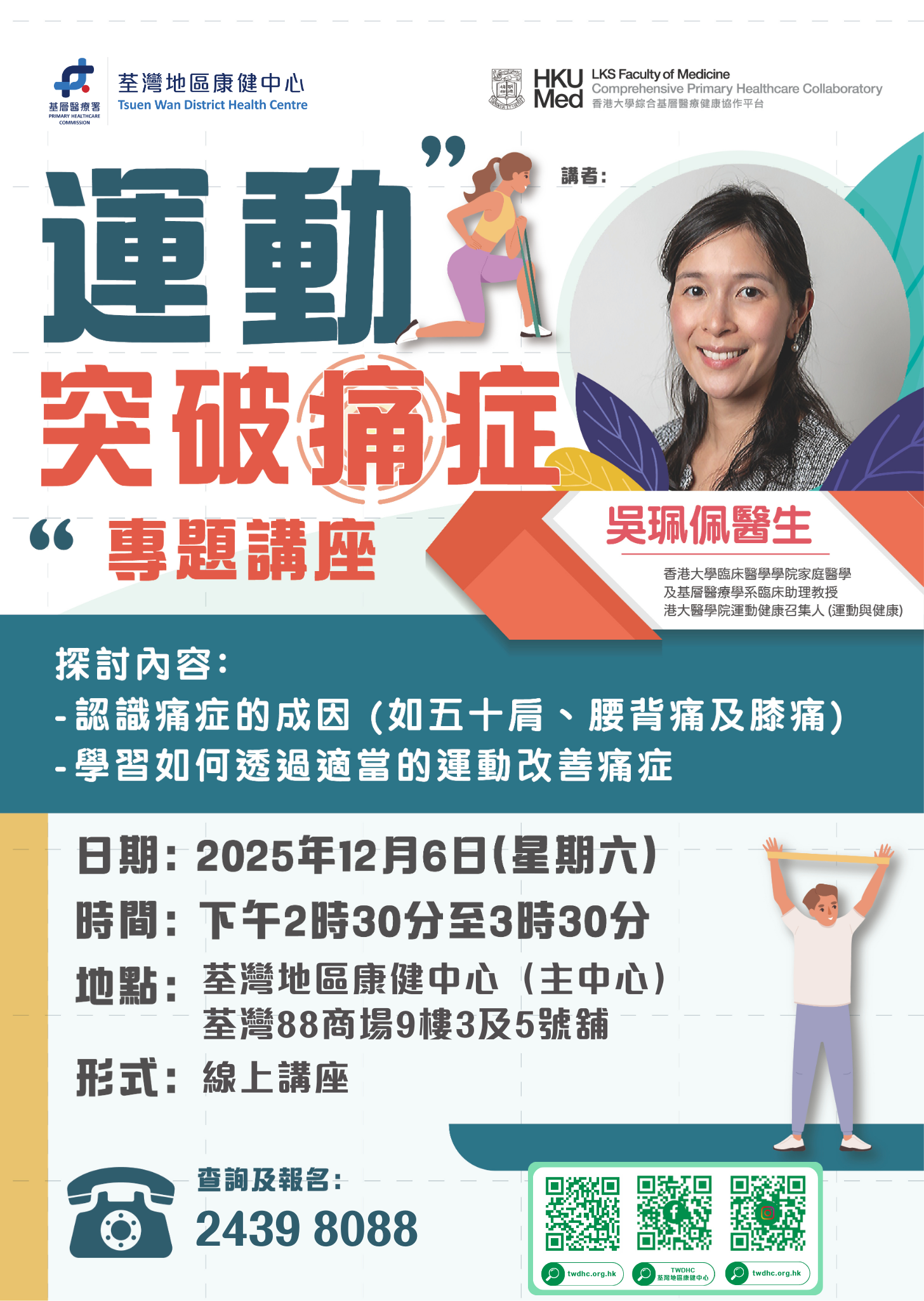 成日覺得肩痛、腰背痛、膝頭痛🤕,以為「休息下就無事」🛌🏻,點知越唔郁動越痛,最後變咗惡性循環☹️?唔洗擔心,我哋今次邀請咗香港大學臨床醫學學院家庭醫學及基層醫療學系臨床助理教授吳珮佩醫生講解運動突破痛症專題講座👩🏻⚕️,俾大家認識痛症嘅成因同學習透過適當嘅運動去改善痛症!🏋🏻