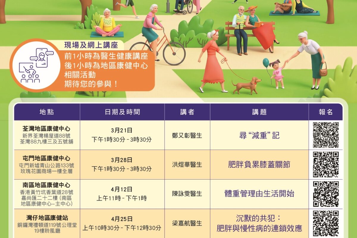 為響應2026年世界肥胖日,荃灣地區康健中心將於3月21日在主中心舉辦「尋”減重”記」健康講座,誠邀鄭又彰醫生主講,幫助大家全面掌握體重狀況,並找到適合自己的減重方式,邁向健康又理想的人生!