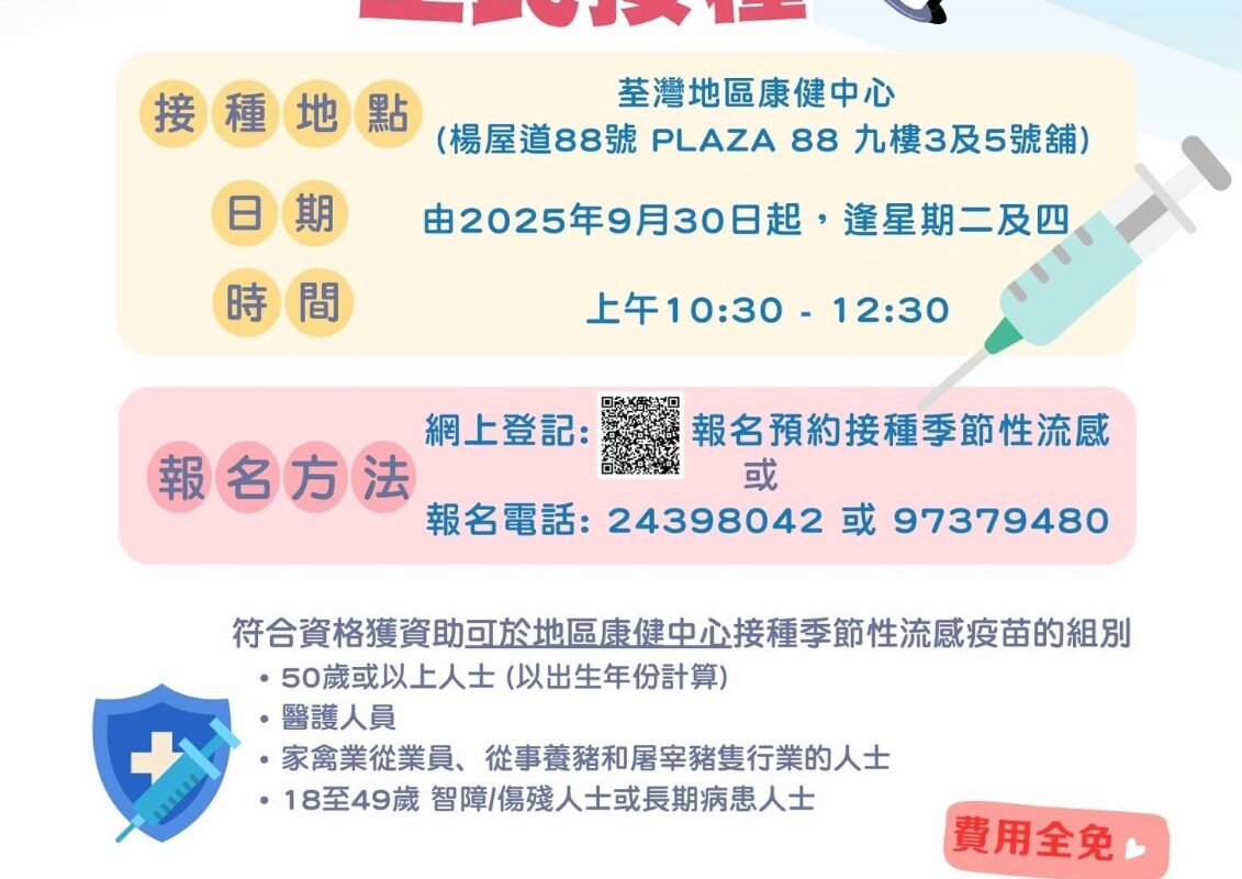 為了讓市民更加方便接種疫苗,我哋荃灣地區康健中心將會向合資格嘅人士提供免費流感疫苗注射服務💪。